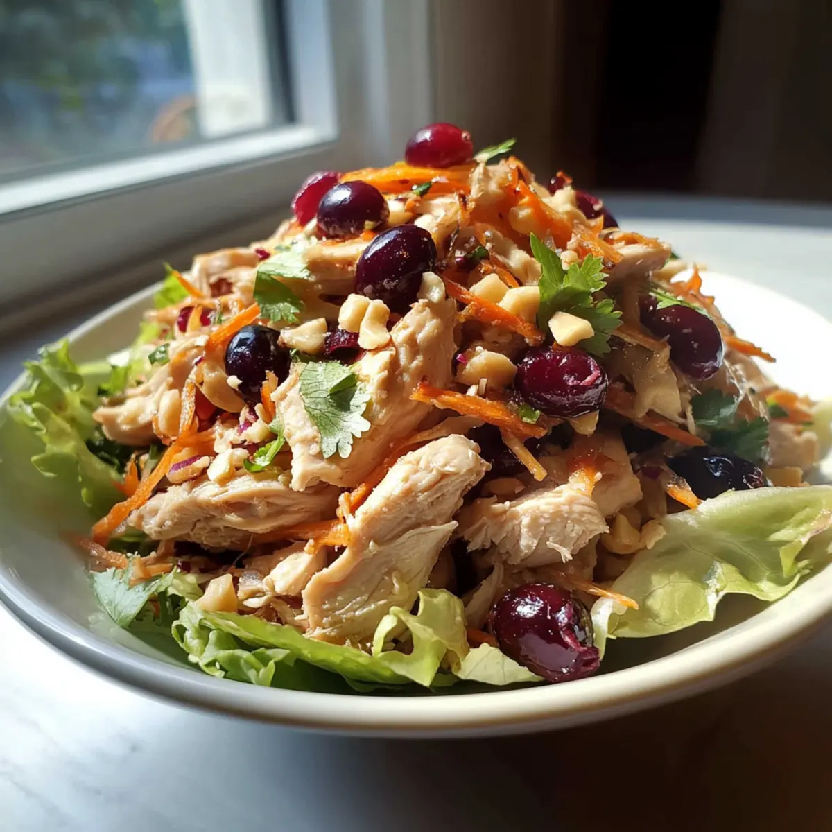 In a large mixing bowl, begin by combining the cooked chicken, dried cranberries, and your choice of leafy greens, such as lettuce cups or spinach. Toss these ingredients together gently, ensuring that the chicken and cranberries are evenly distributed among the greens. The vibrant colors will make you smile, signaling a fresh start to your Asian Chicken Cranberry Salad.