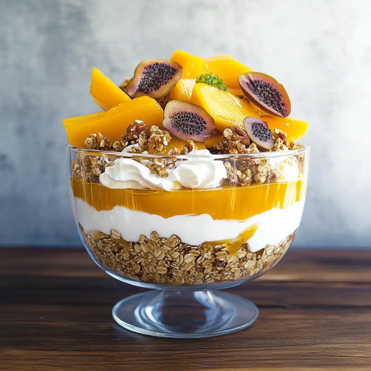 Take your fresh fruits—peel and slice the ripe mango and papaya into bite-sized pieces. Cut the passionfruit in half and scoop out the seeds. If using dragon fruit, slice into wedges or rounds for added color. Arrange the prepared fruits on a plate, ensuring a vibrant display that will enhance your Breakfast Trifle’s visual appeal.