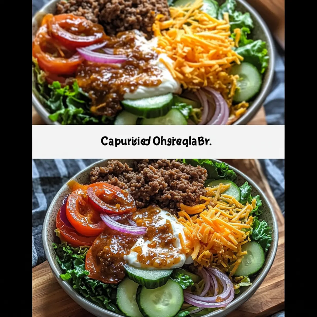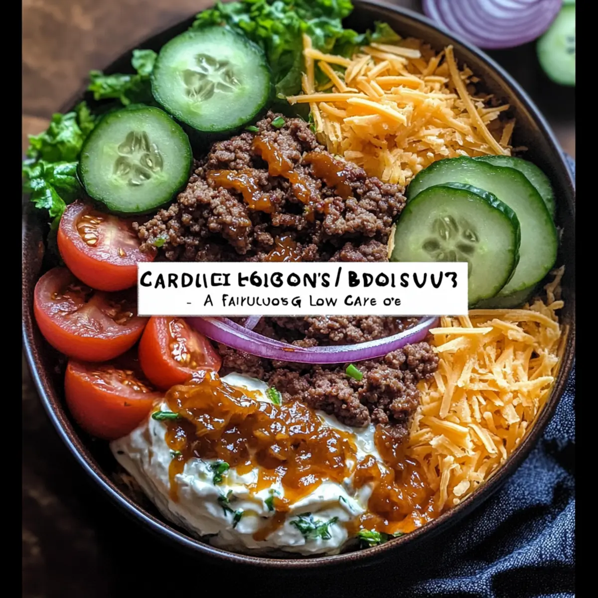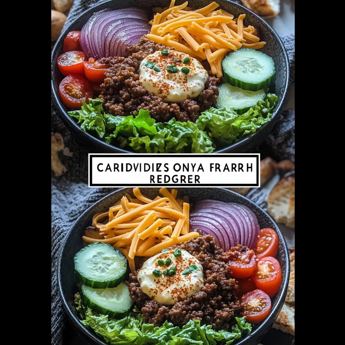 To build your Burger Bowls, start with a generous layer of fresh greens as the base. Add a serving of the cooked ground beef on top, followed by a vibrant mix of chopped tomatoes, cucumbers, red onions, and pickle slices. Drizzle with the caramelized onion aioli, sprinkle with shredded cheddar cheese, and finish with a garnish of fresh chives to add that extra touch of flavor and color. Serve immediately and enjoy!