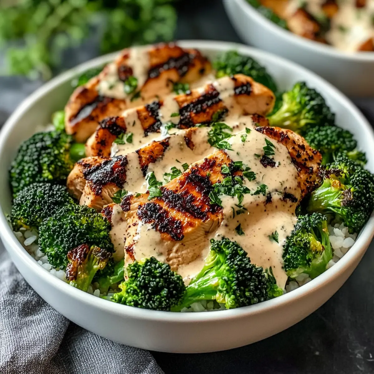 Savory Grilled Chicken & Broccoli Bowls with Creamy Garlic Sauce