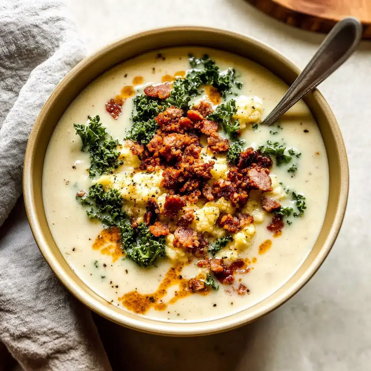 These Cauliflower Sausage Kale Soup preparations are ideal for busy home cooks looking to save time during the week! You can chop the onions, garlic, and cauliflower up to 24 hours in advance. Store them in airtight containers in the refrigerator to prevent them from browning and losing freshness. You may also cook and crumble the sausage and bacon, keeping them in the fridge for up to 3 days. When you’re ready to enjoy your soup, just combine the prepped ingredients with the broth, simmer, and blend as directed. This straightforward prep ensures your soup maintains its delicious, creamy texture while significantly cutting down on cooking time for a quick dinner solution!
