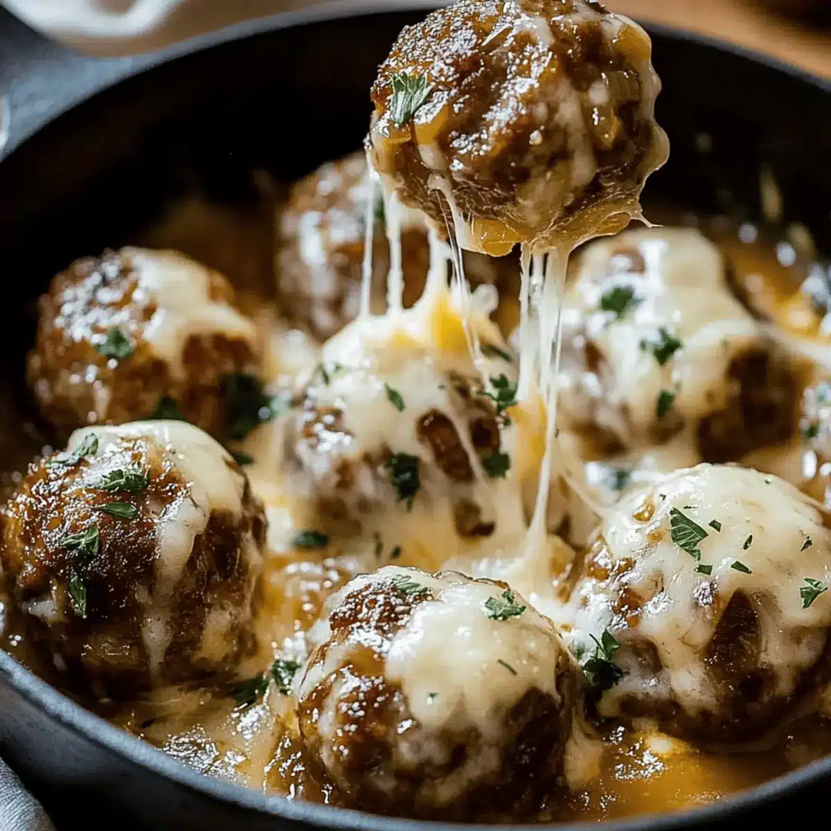 Comfort Food Reimagined: These Cheesy French Onion Meatballs transform a beloved classic into a satisfying dish the whole family will adore.