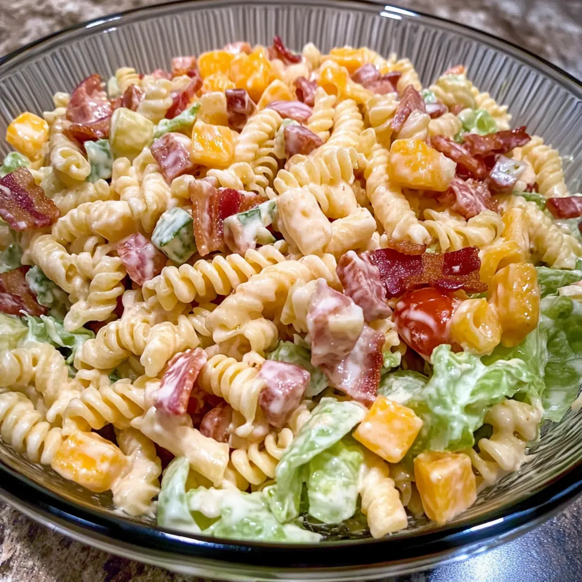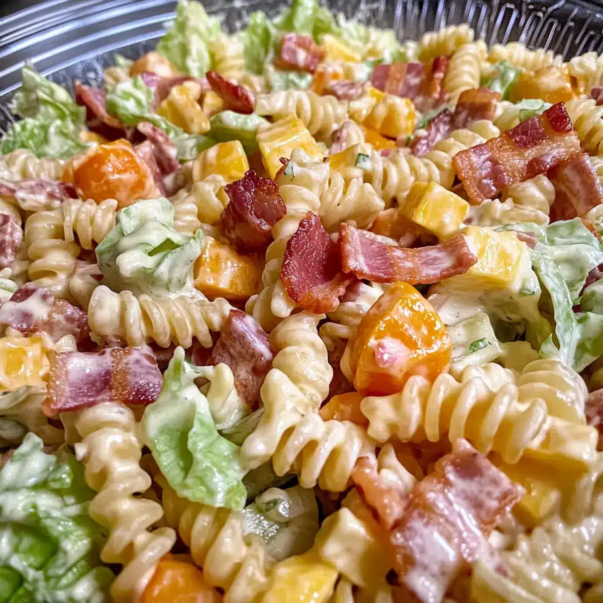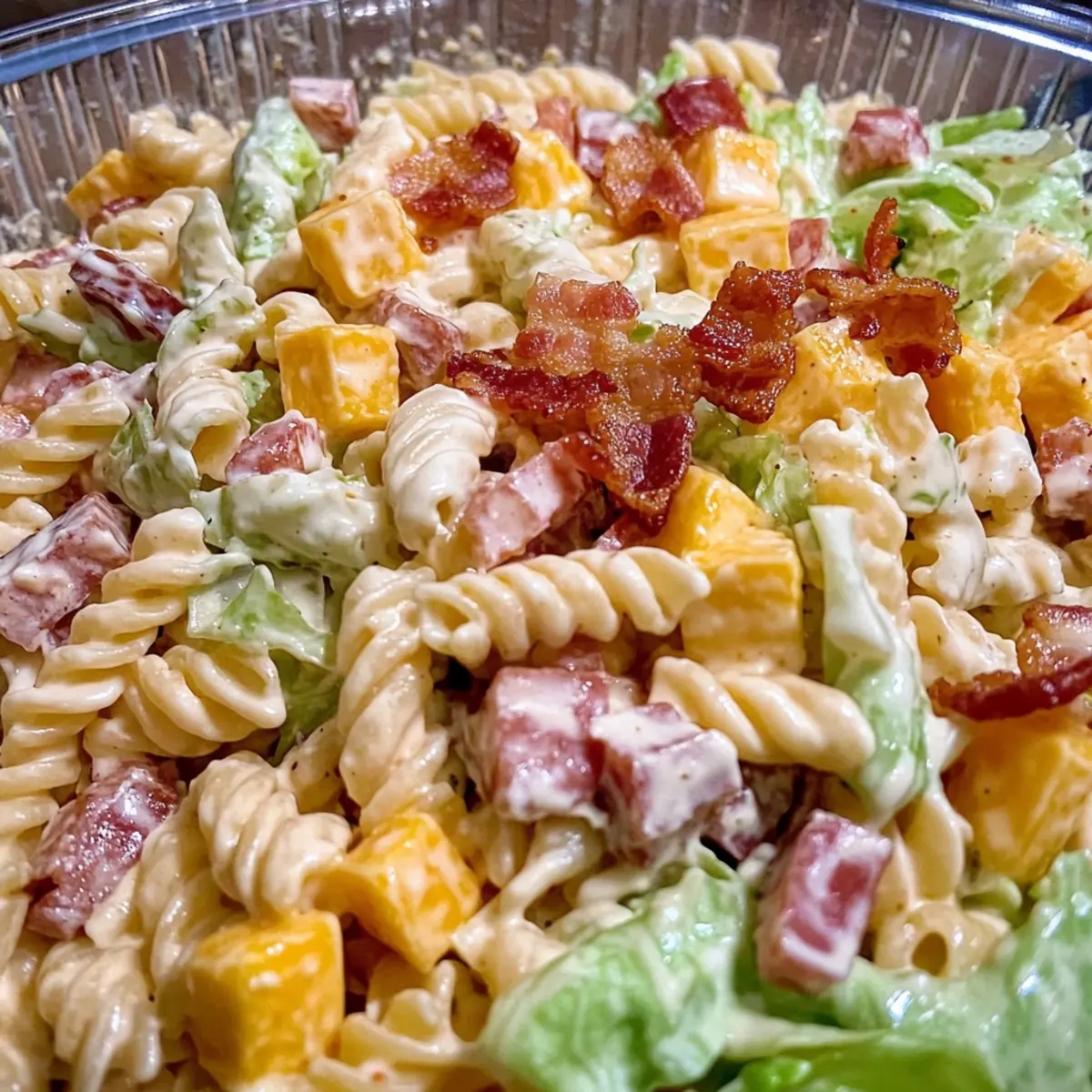 - In a large bowl, combine cooled pasta with cubed cheddar cheese, crispy bacon, diced lettuce, diced ham, and diced tomato. Gently fold to combine.