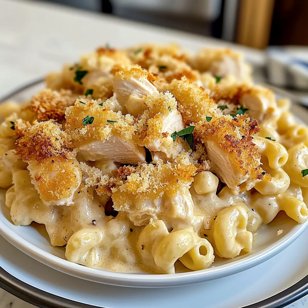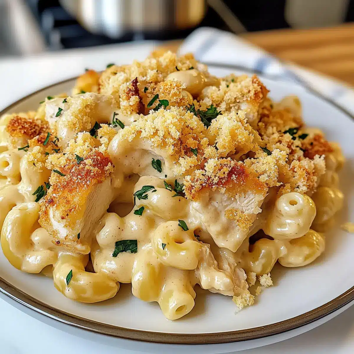 If desired, transfer the creamy chicken mac and cheese mixture into an oven-safe baking dish. For a delightful crunch, sprinkle panko breadcrumbs evenly on top. Preheat your oven to 350°F (175°C) and bake for about 20 minutes or until the topping is golden brown and crisp. This optional step adds a lovely texture contrast on top of your creamy delight!