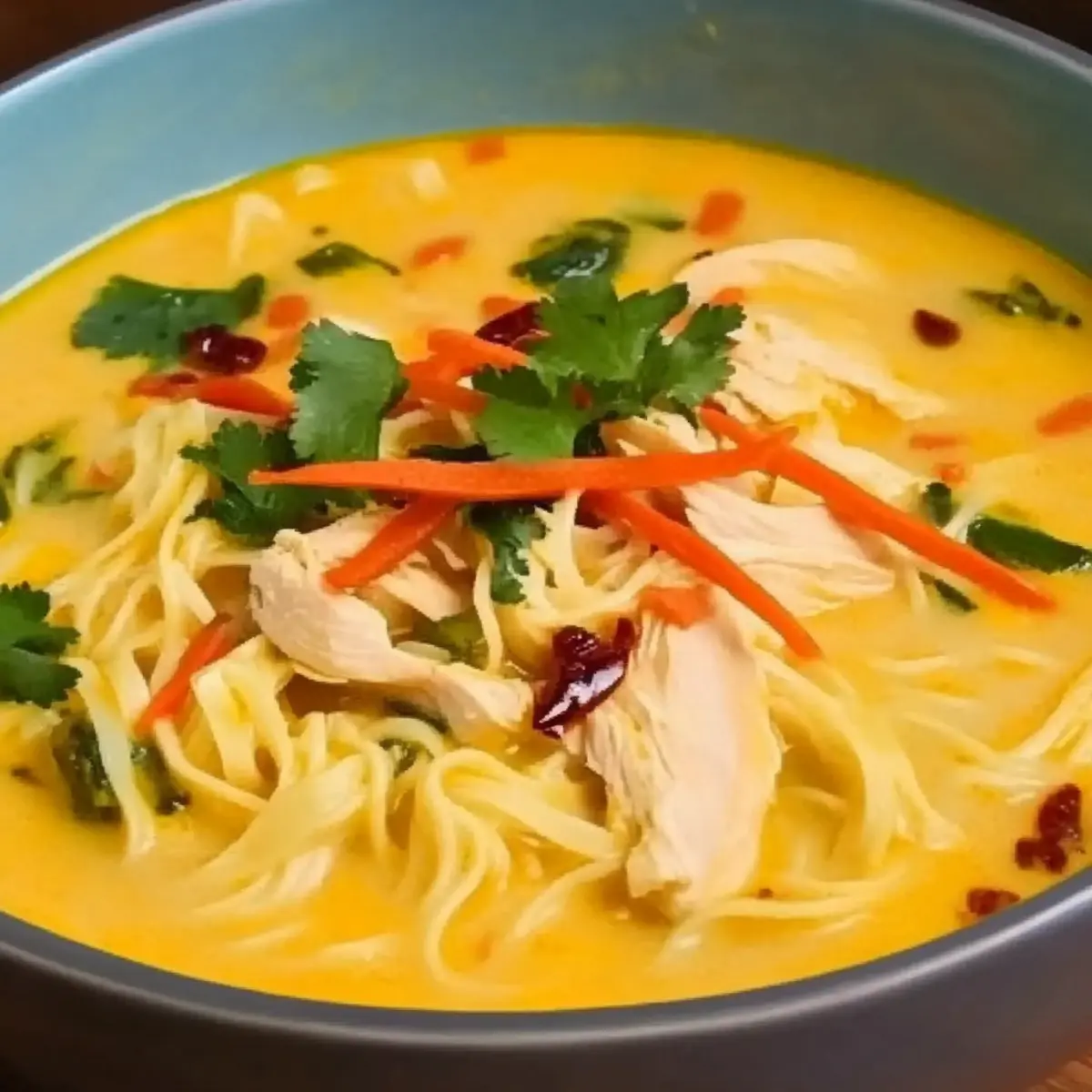 Once the noodles are cooked to your liking, ladle the soup into warm bowls. Garnish with fresh herbs, a squeeze of lime, and any additional toppings such as sesame seeds or crushed peanuts for added texture and flavor. Your Creamy Chicken Noodle Soup is now ready to be enjoyed!