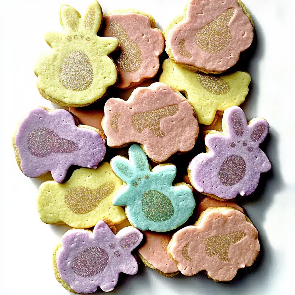 Remove the cookies from the oven and let them cool on the baking sheets for about 10 minutes. If using edible glitter, lightly dampen the tops of the cooled cookies with a splash of water, then sprinkle the glitter generously. This finishing touch adds a festive sparkle, making your Easter Cutout Shortbread Cookies even more delightful!