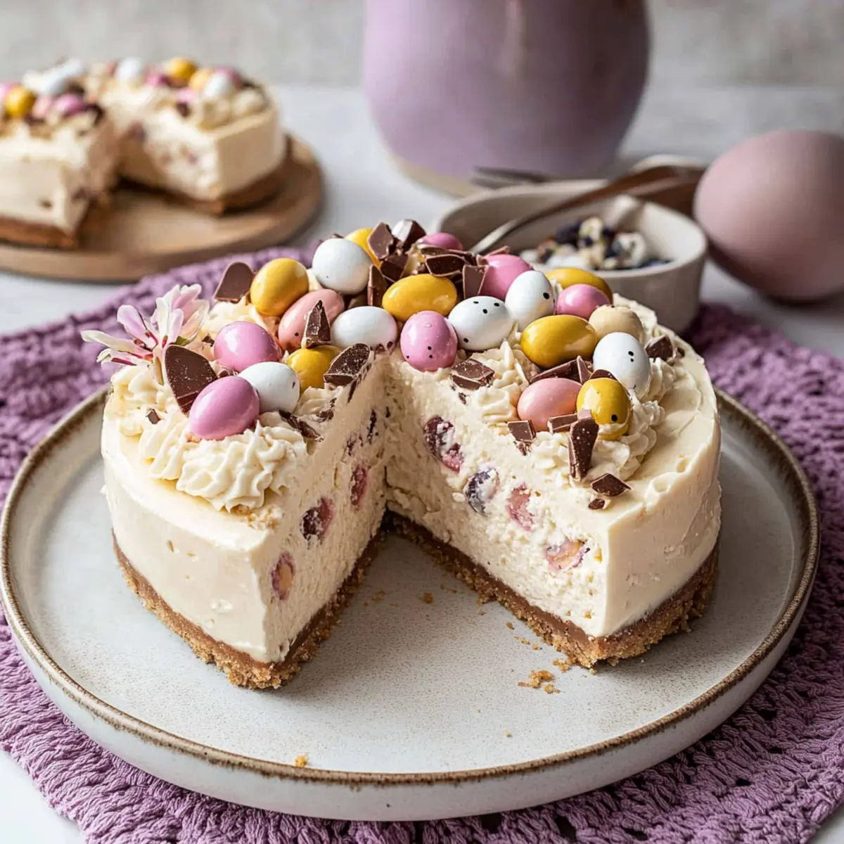 Festive Decoration: Enhance your cheesecake with additional Cadbury Mini Eggs and seasonal flowers on top for a visually appealing Easter centerpiece.