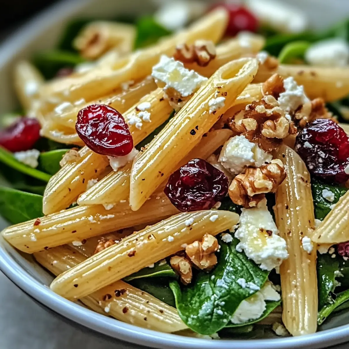 Make ahead with ease! Simply prep all the salad ingredients—boil your penne, chop the spinach, and mix in the cranberries and feta—then store them without the vinaigrette in the fridge. When ready to serve, just whisk the vinaigrette and drizzle it over the salad! This keeps everything fresh and crisp, perfect for busy days!