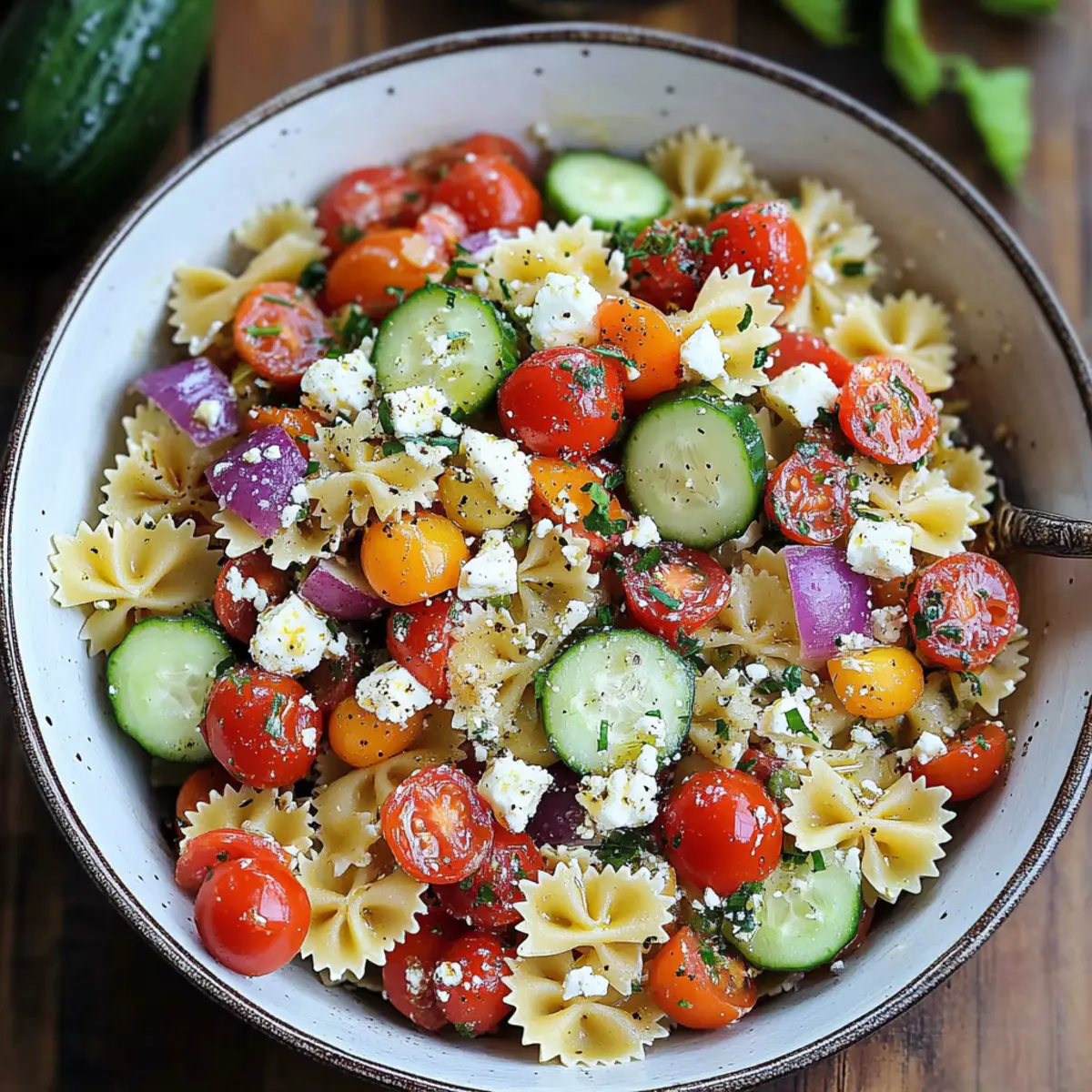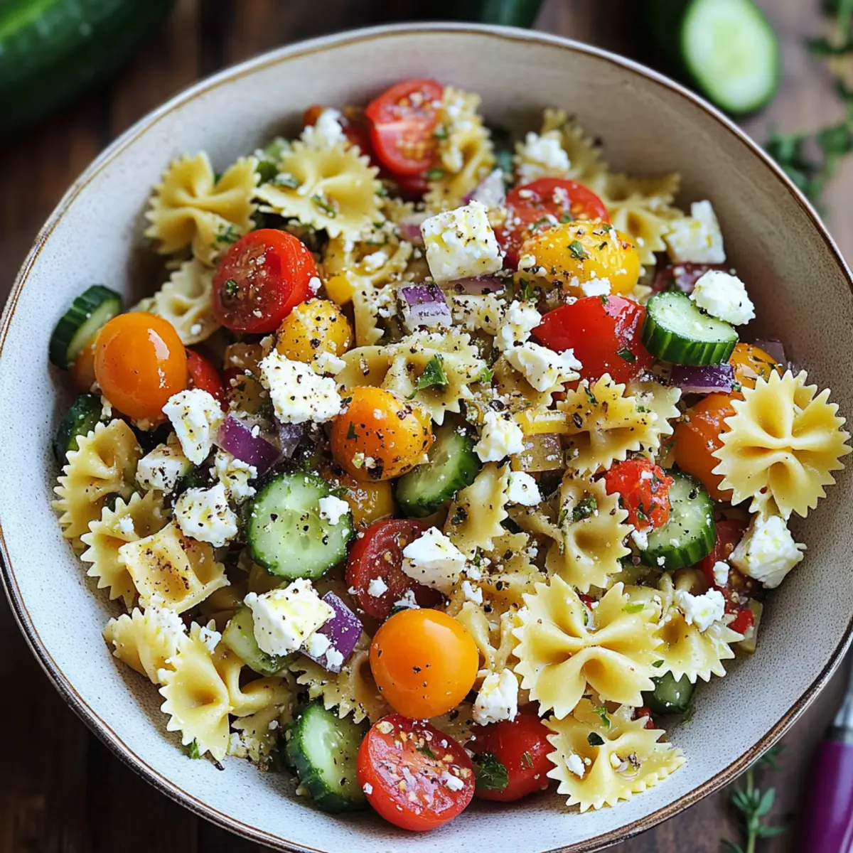 As I whisked together a sun-kissed dressing of lemon juice and olive oil, the tantalizing aroma transported me straight to the charming streets of Santorini. This 20-Minute Greek Pasta Salad is my go-to for summer gatherings, marrying the vibrant flavors of the Mediterranean with the ease of a quick preparation. The salad bursts with crunchy cucumbers, juicy tomatoes, and creamy feta cheese, making it a refreshing side dish or a light meal that’s perfect for any occasion. Not only is it vegetarian and gluten-free (when using the right pasta), but it also packs well in the fridge, allowing the flavors to deepen over time. Whether you’re serving it at a picnic or enjoying it at home, this delightful dish is bound to be a crowd-pleaser! Curious about how to make this delicious treasure? Let’s dive in!
