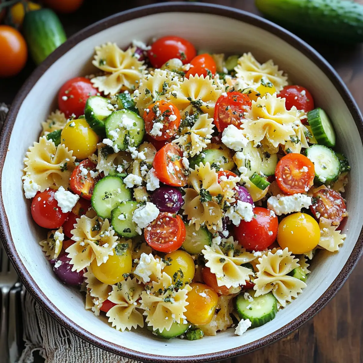 These Greek Pasta Salad preparations are perfect for busy weeknights and can save you precious time! You can cook the pasta and let it cool, storing it in the refrigerator for up to 3 days. The dressing can also be whisked together and refrigerated separately for up to 24 hours to maximize freshness, allowing all flavors to meld without compromising texture. For the vegetables, chop them ahead of time and keep them in an airtight container in the fridge for up to 2 days. When you’re ready to serve, simply combine the pasta, marinated veggies, and feta cheese in a large bowl—this ensures your Greek Pasta Salad remains just as delicious and vibrant!