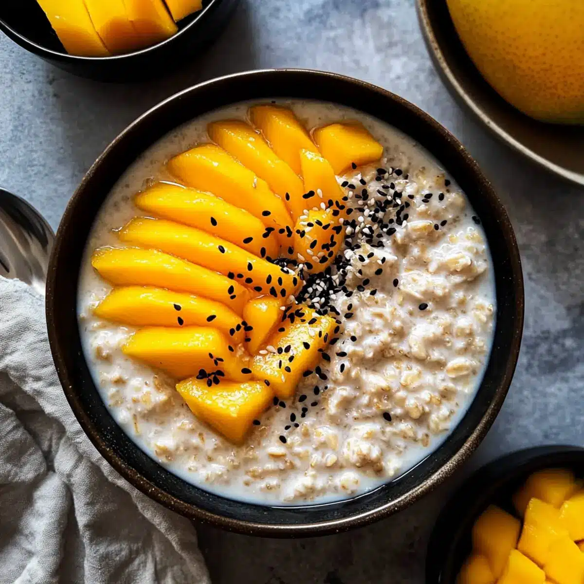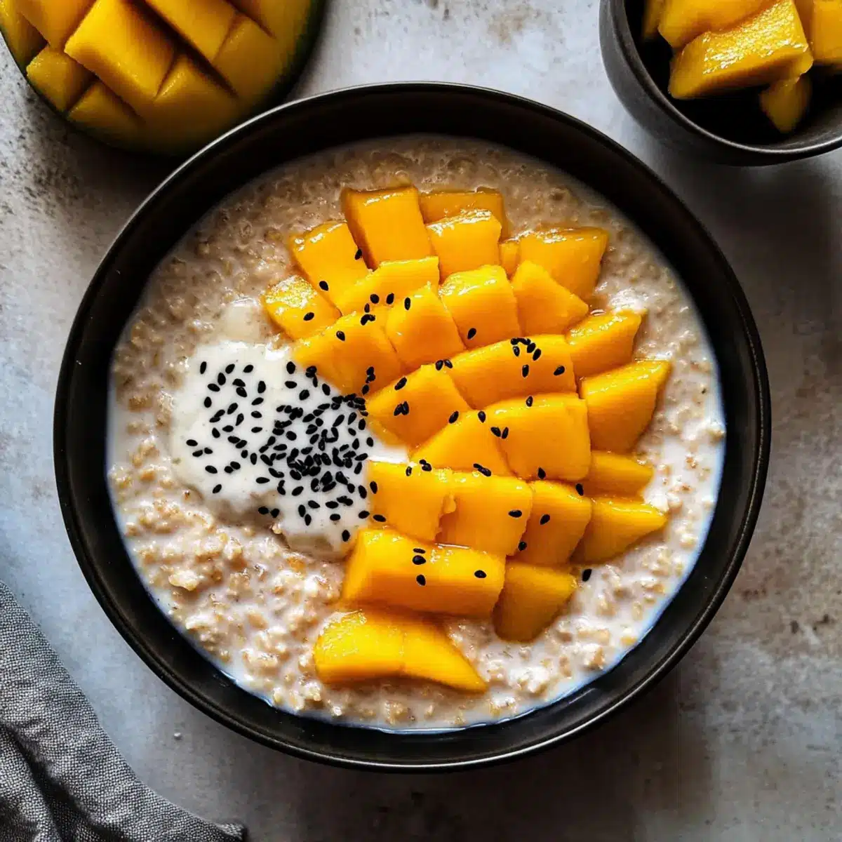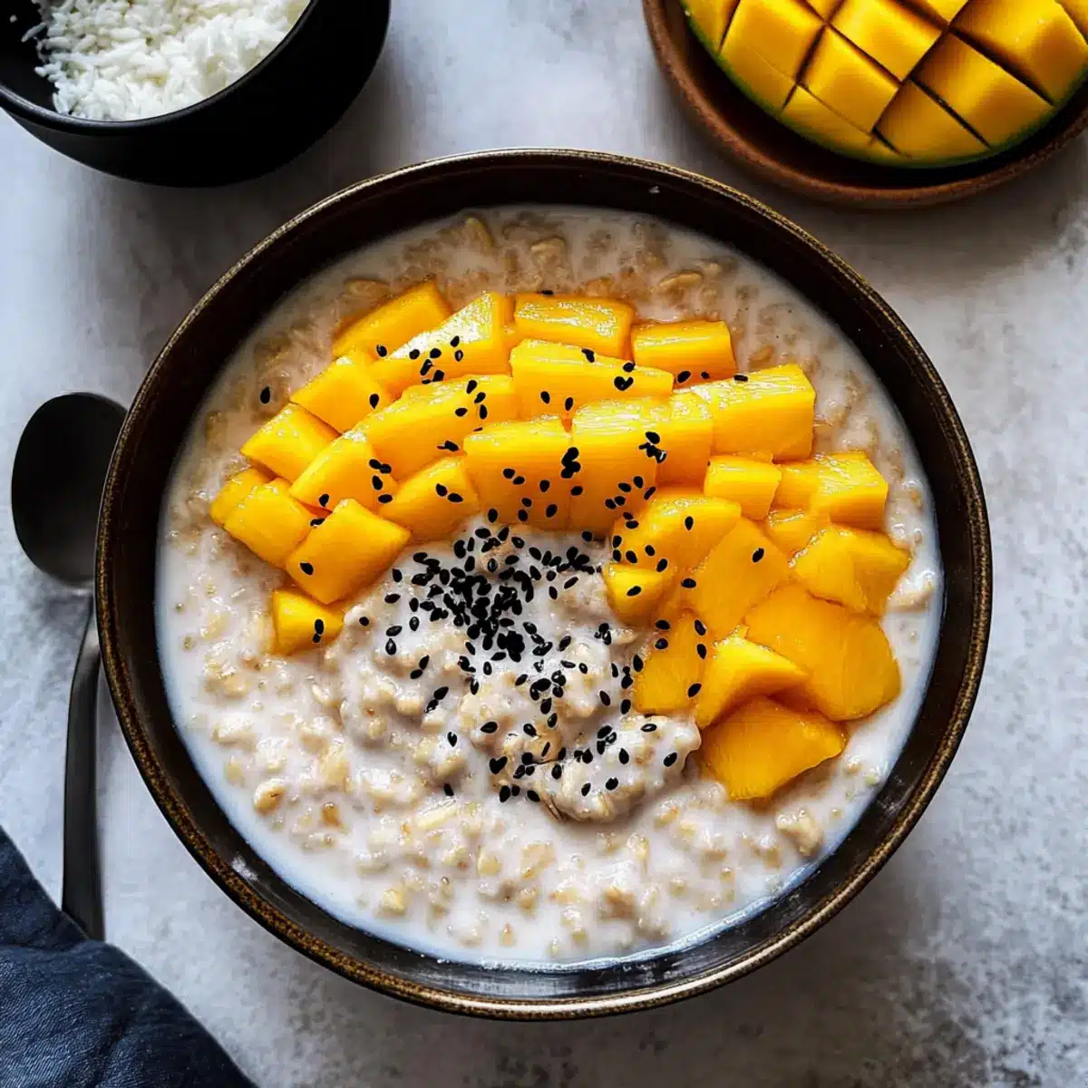 To assemble your Mango Sticky Rice Oatmeal, spoon the creamy oatmeal into bowls. Generously top with freshly sliced mango and drizzle with the warm coconut sauce you just prepared. If desired, sprinkle with a dash of black sesame seeds or a pinch of chili powder for an unexpected kick. This warm, indulgent breakfast awaits your delightful discovery!