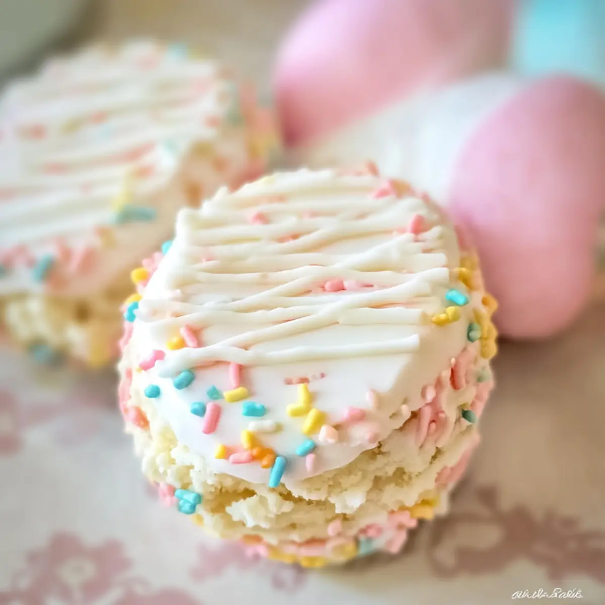 In a microwave-safe bowl, melt the coconut oil and vanilla almond bark together, heating in 30-second increments and stirring until smooth. Carefully dip each cake into the melted coating, using a fork to lift it out and allowing excess to drip off. Place the coated cakes on a lined baking sheet. Once set, drizzle with colored almond bark and top with sprinkles for a festive touch, transforming your treats into charming Mini Easter Egg Cakes.