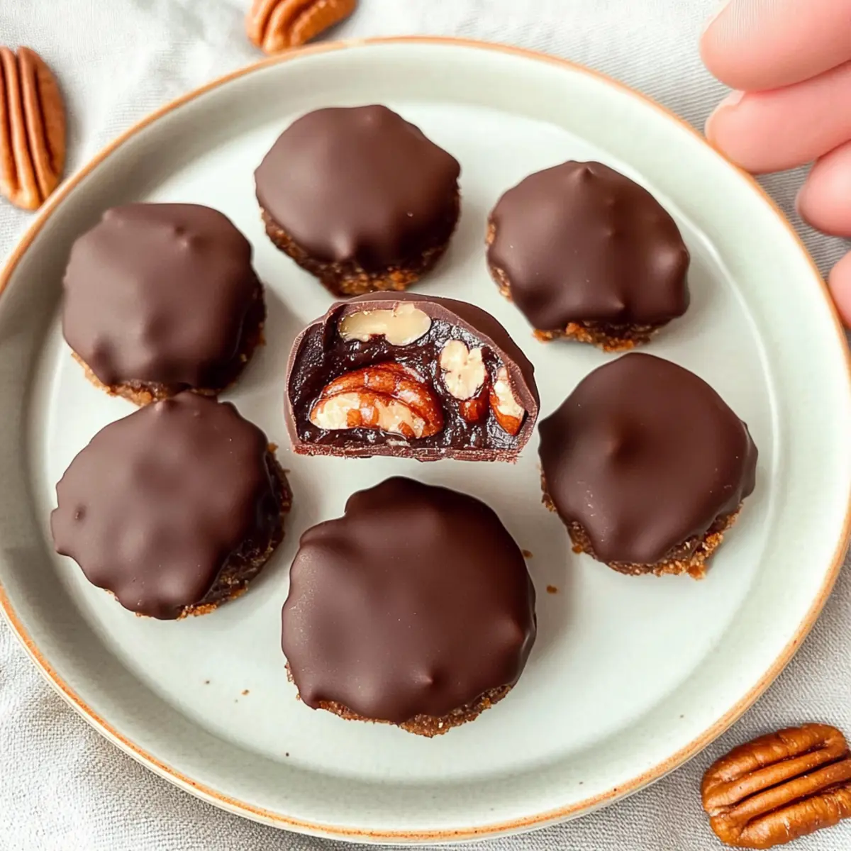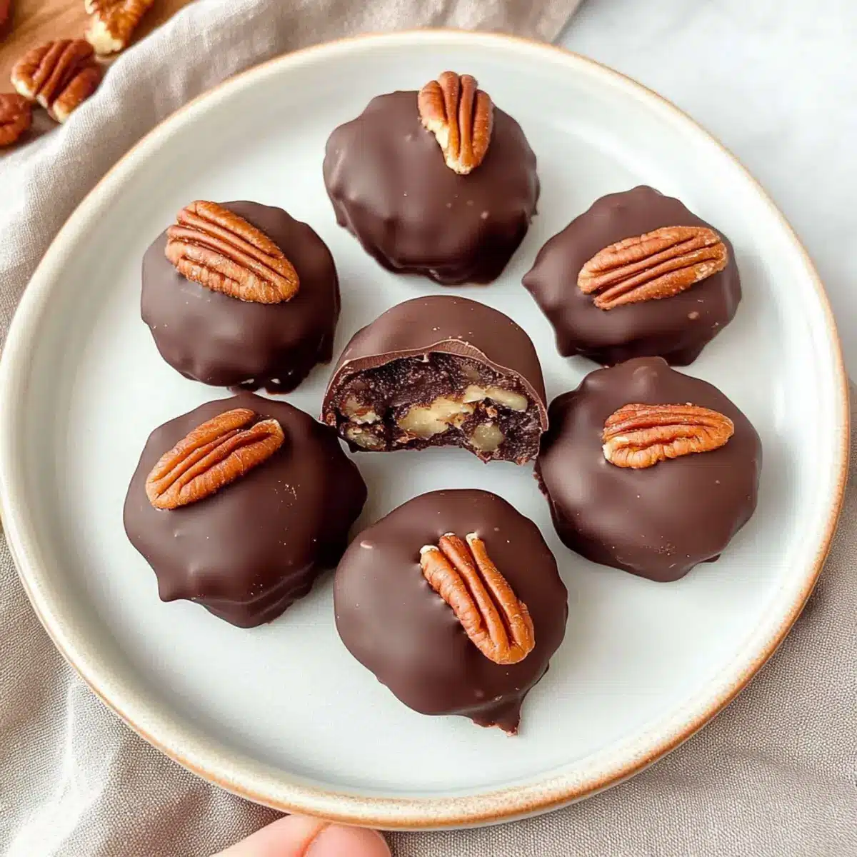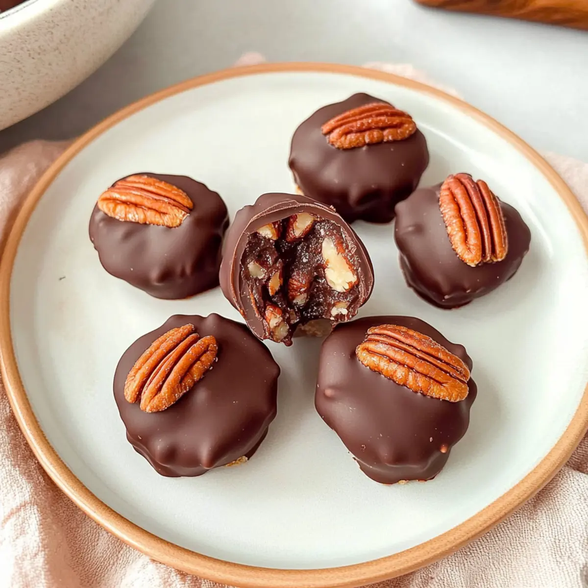 - Dip each firm bite into the melted chocolate, then place back on the cookie sheet. Top with a whole pecan if desired.