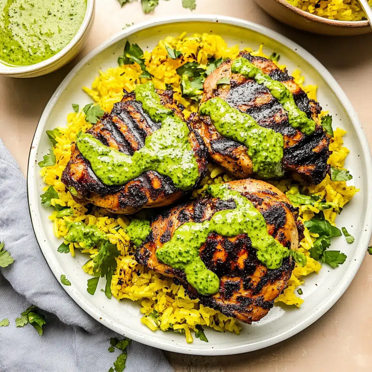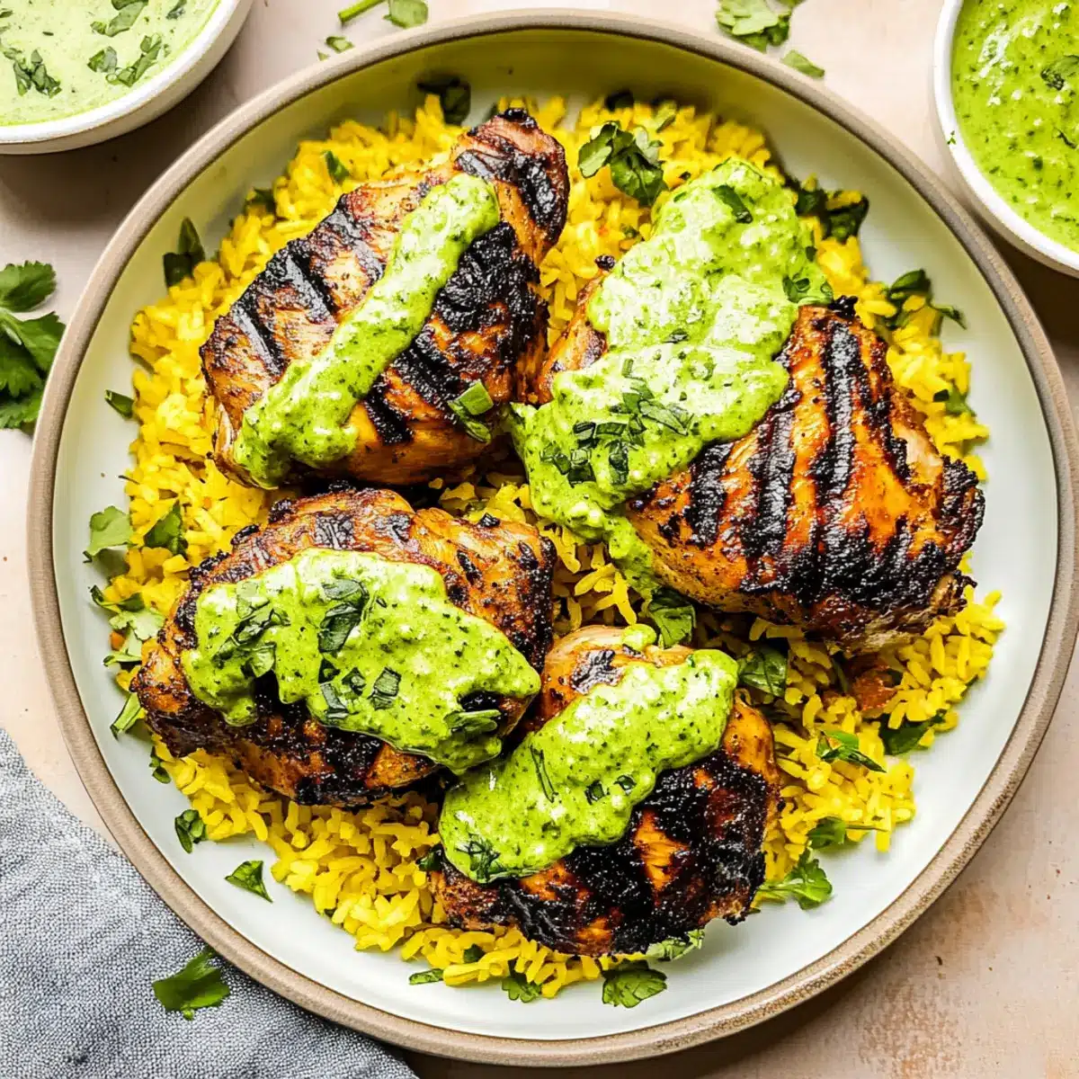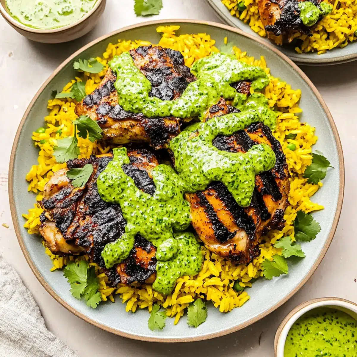 - Serve by scooping seasoned rice onto plates, placing grilled chicken on top, and drizzling the creamy green sauce over the chicken. Garnish with additional cilantro if desired.