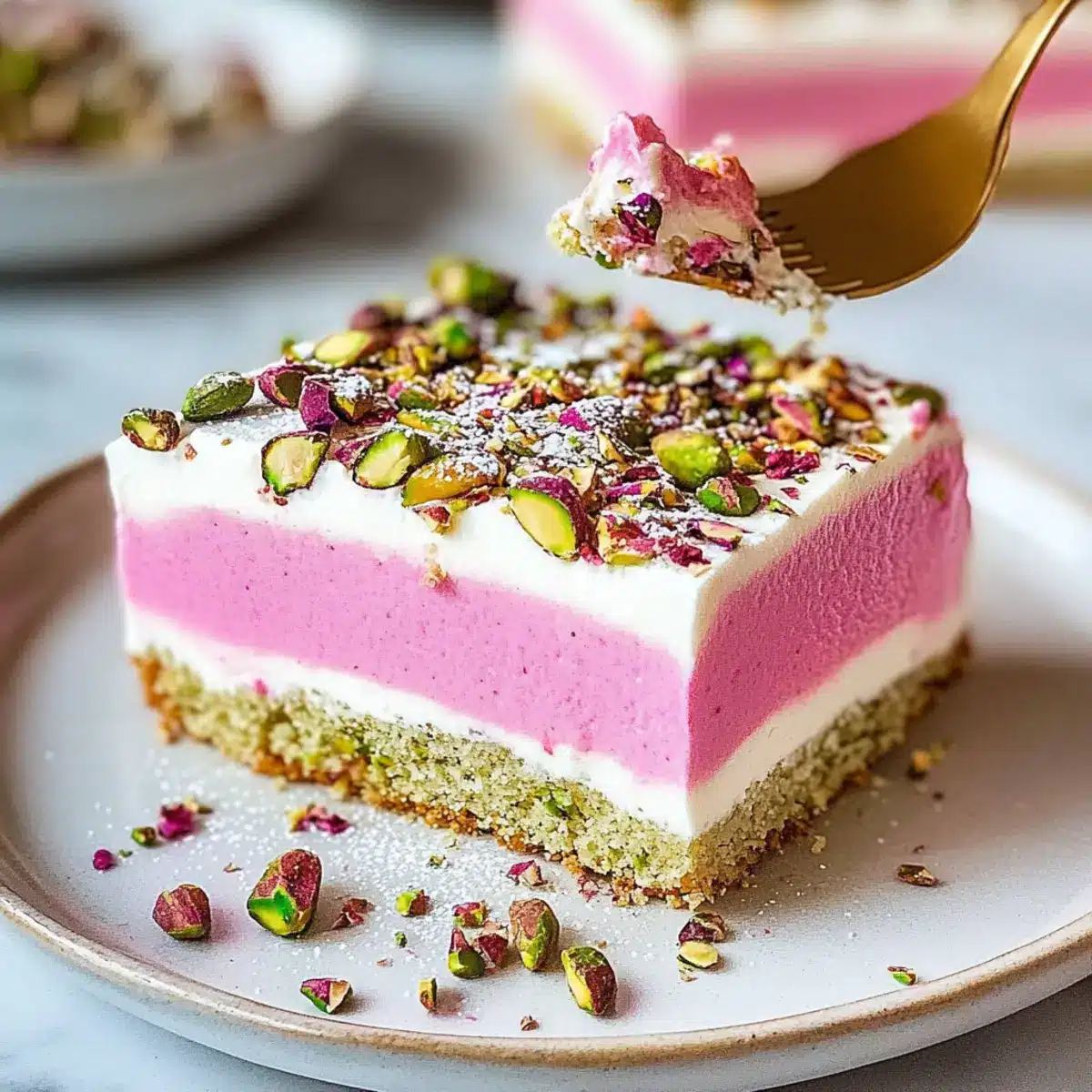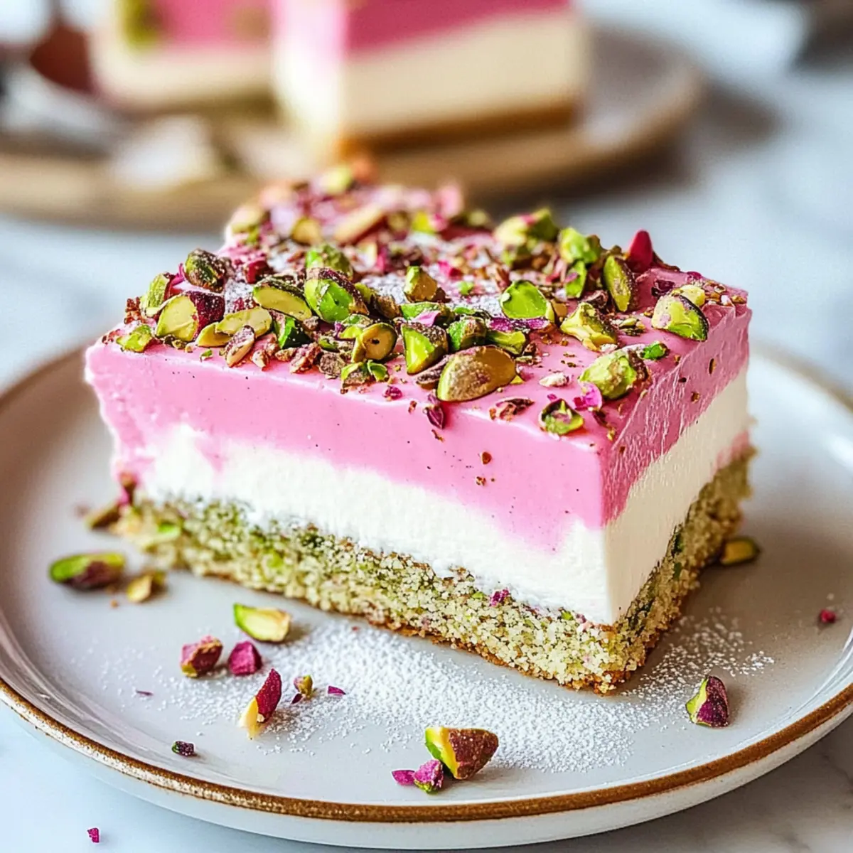 Once fully cooled, you can dust the top of your Pistachio Rose Milk Cake with powdered sugar or drizzle with icing for added sweetness and presentation. This delightful cake is perfect for serving at celebrations or simply enjoying with a cup of tea, inviting everyone to savor each enchanting bite.