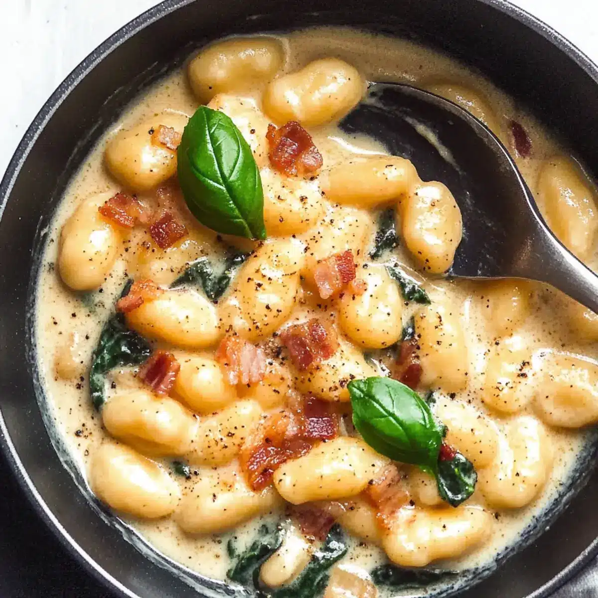 - Add fresh spinach, stirring to wilt for about 1 minute. Return cooked bacon to the pan, mixing everything together. Taste and adjust seasoning before serving, garnishing with extra Parmesan cheese and fresh basil leaves.