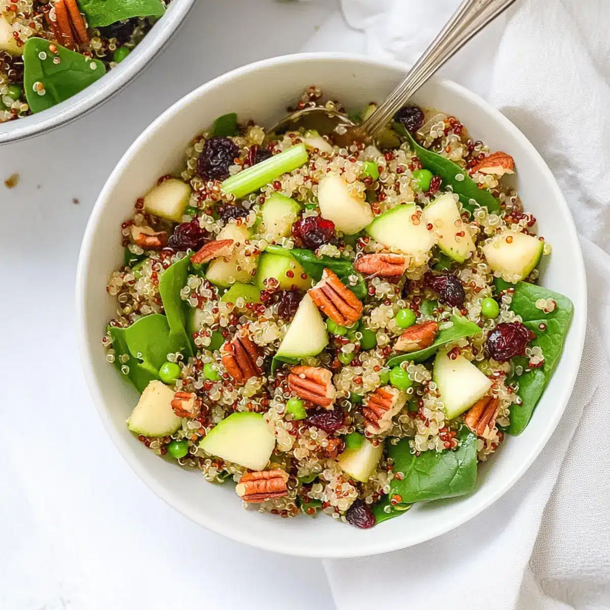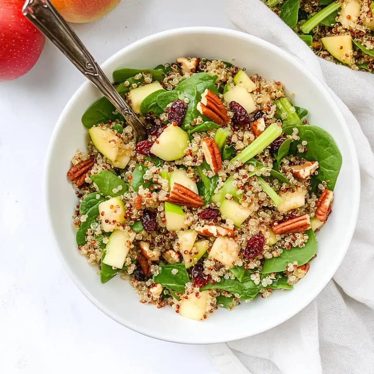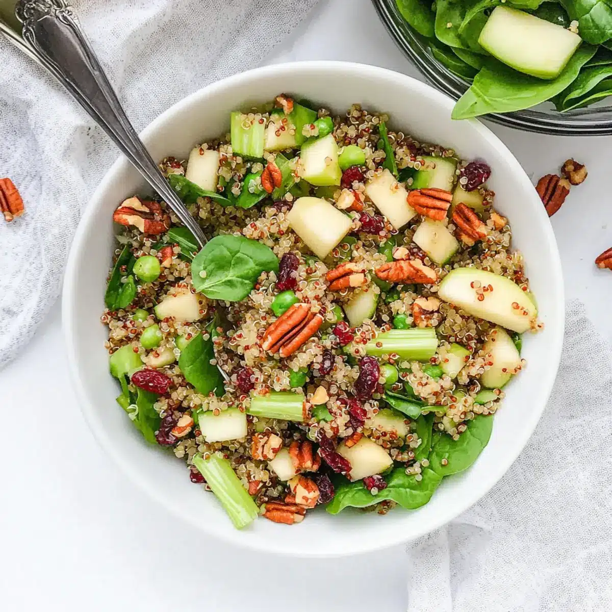 - In a large bowl, combine cooled quinoa, 1 diced green apple, 1 diced Honeycrisp apple, 2 cups spinach leaves, 1 cup chopped celery, and ½ cup dried cranberries or cherries. Add ½ cup toasted pecans or walnuts, and toss gently until mixed.