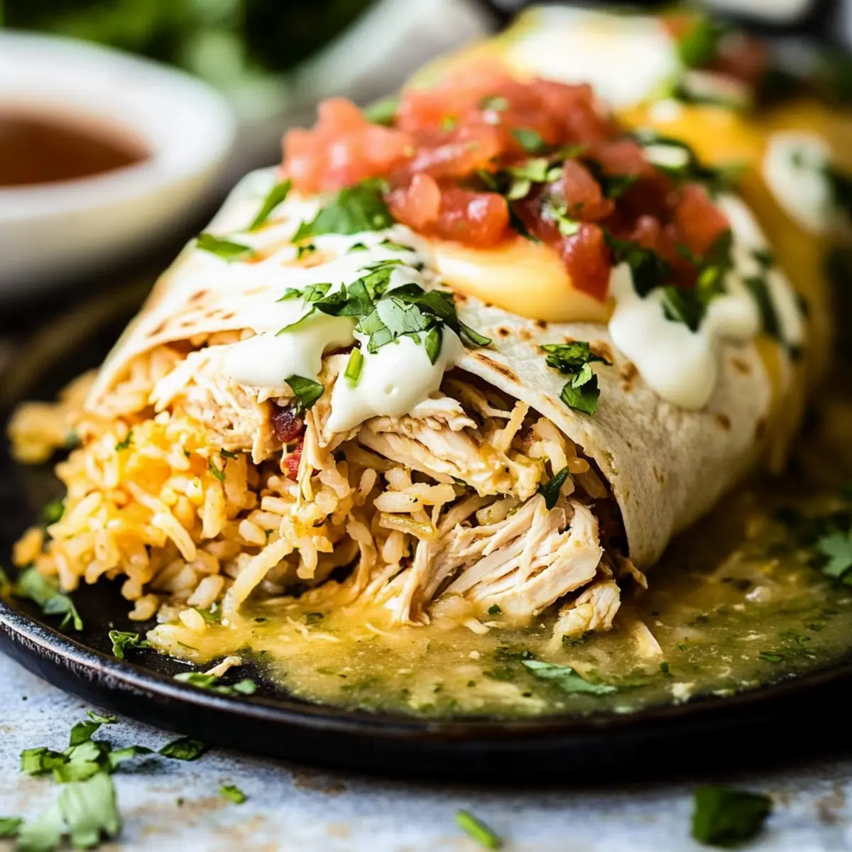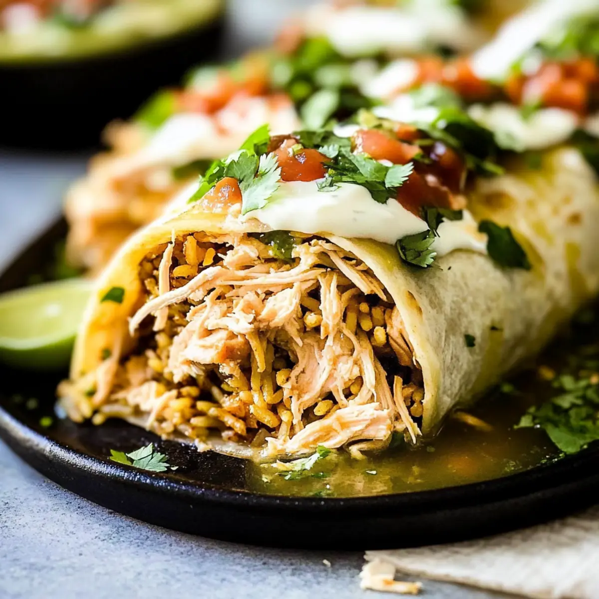 - Assemble the Burritos: Fill tortillas with rice, beans, chicken, and cheeses; roll tightly.