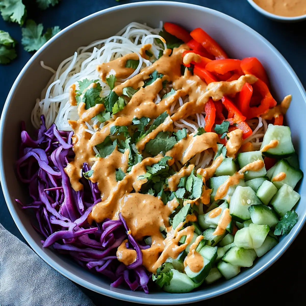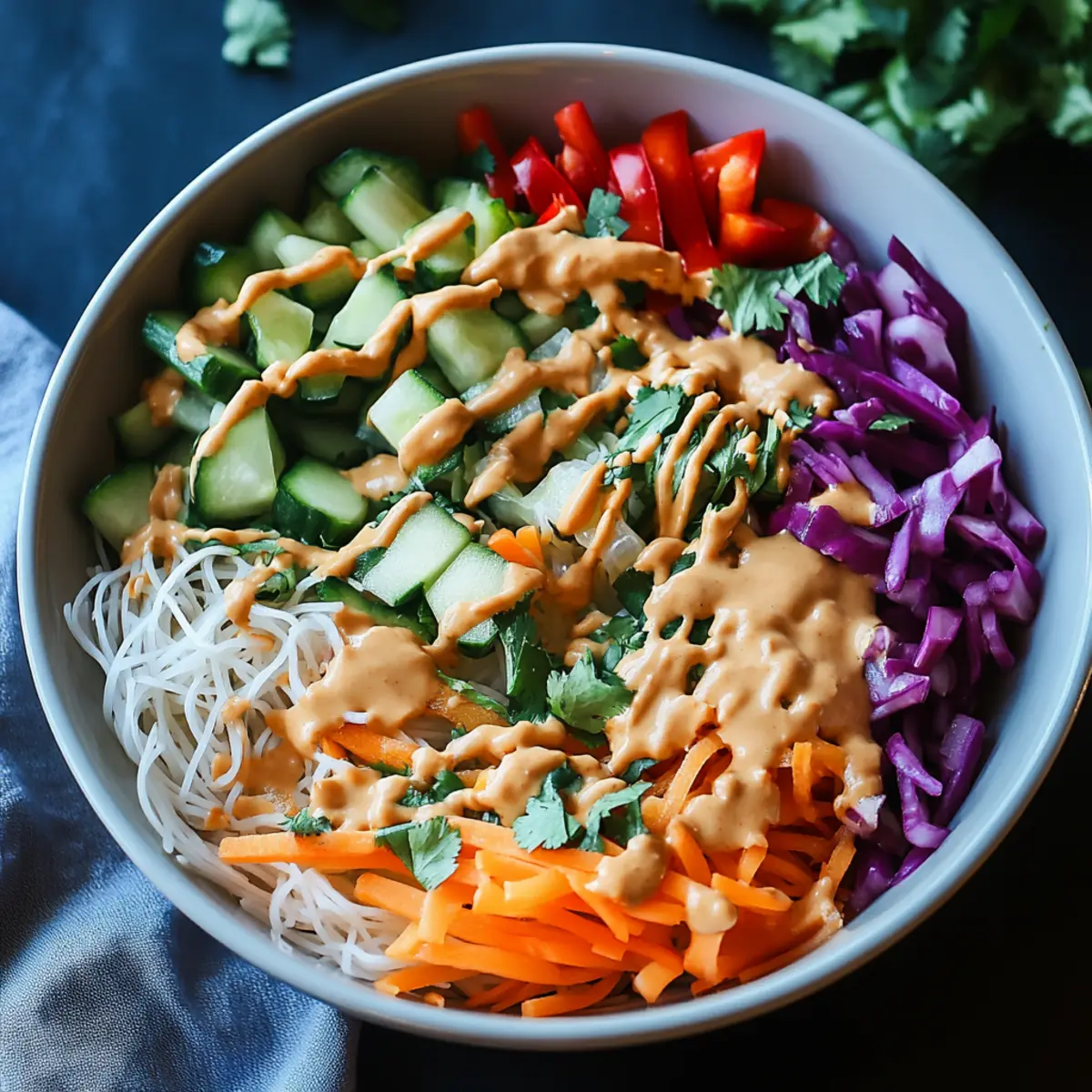 - In a large mixing bowl, combine the cooked rice noodles, chopped cucumber, shredded purple cabbage, grated carrot, and sliced red bell pepper. Add fresh cilantro and mint, and mix in chopped peanuts.