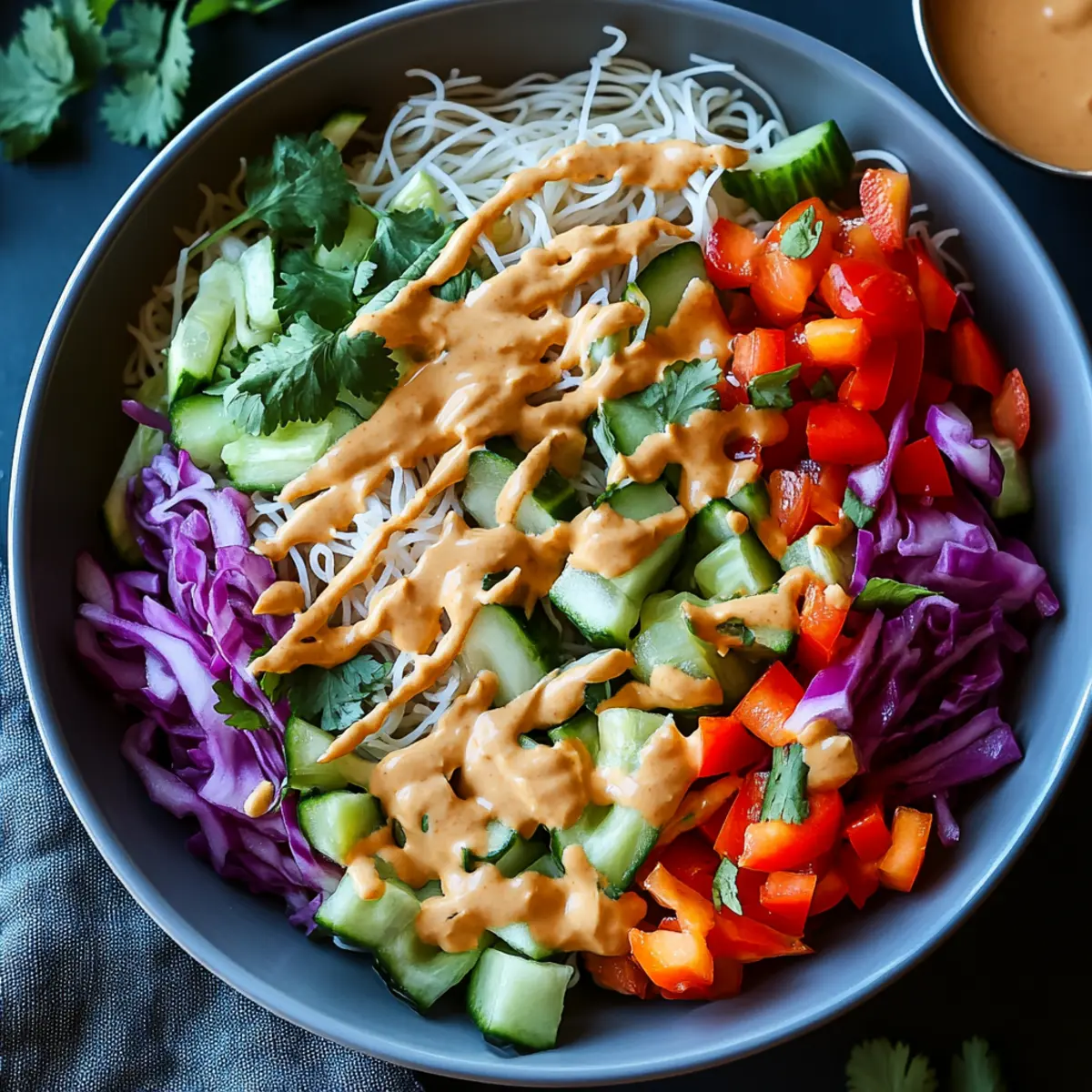 In a large mixing bowl, combine the cooked rice noodles, chopped cucumber, shredded purple cabbage, grated carrot, and sliced red bell pepper. Toss in the fresh cilantro and mint, adding chopped peanuts for a delightful crunch. Ensure that the ingredients are vibrant and evenly mixed, creating an inviting base for your salad.